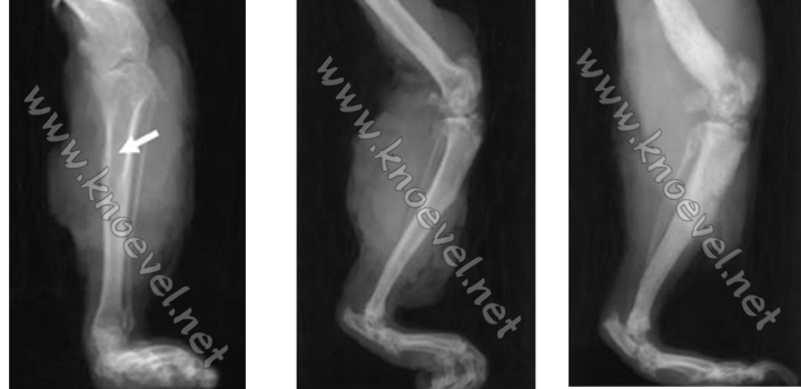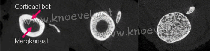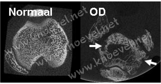 Op een dwarsdoorsnede-scan door het kniegewricht ziet men cystische laesies (typische grote kuilen, aangegeven door pijlen). De normale structuur van het trabeculaire bot is vervangen door amorfe (kalkrijke) eilanden en holtes. ------------------------------------------------------------------------------------------------------ Niet satijn (ca. 6 jaar), satijn met beginnende OD (4 jaar), satijn met gevorderde OD (2 jaar)