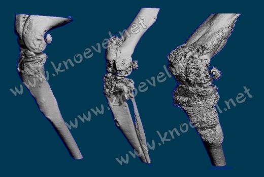 Het is duidelijk dat de ziekte progressief de botstructuur aantast. De vervorming van het kniegewricht duidt op een ernstige artritis - het verklaart ook de pijn die OD patiënten moeten verduren. Het meest opvallende is echter de vorming van amorfe (poreuze) botmassa, en het ontstaan van gaatjes in het botoppervlak (zie onder). De nieuwe botmassa (rechter foto) doet ons denken aan bepaalde soorten botkanker bij mensen en andere dieren. ------------------------------------------------------------------------------------------------------