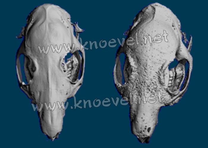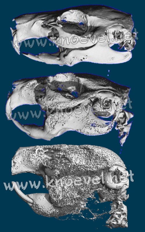 Hierboven vindt u de 3D reconstructie van een cavia schedel (linker zijaanzicht). Opnieuw zien we hier de progressieve degradatie van het bot: het botoppervlak wordt aangetast (kuilen) en de kaken lossen progressief op. De tanden blijven intact.
